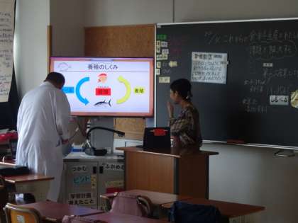 社会科で水産業の勉強をした5年生。今年も「ヒラメの養殖」に挑戦です。講師の水槽の準備もしていただき、今日は、クラスごとの教室でヒラメについてお話を伺いました。学級閉鎖の5年2組もオンラインで授業を受けました。この後、いよいよヒラメの受け入れです。