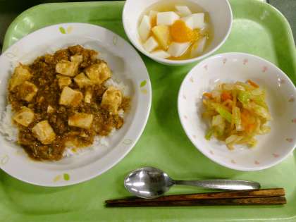 麻婆豆腐丼 牛乳 中華サラダ 杏仁豆腐