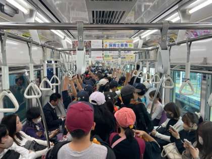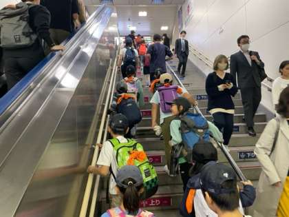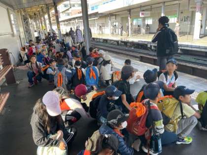 明大前駅で京王線に乗りかえです。通勤のお客さんの迷惑にならないよう静かにしましょう。