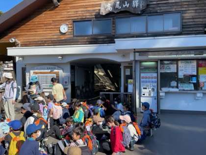 高尾山駅でケーブルカーを待っています。秋の行楽シーズンで混んでいます。