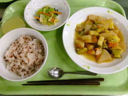 赤米ごはん 牛乳 豚肉と大根の煮物 野菜のみそドレあえ りんごゼリー