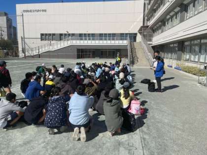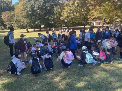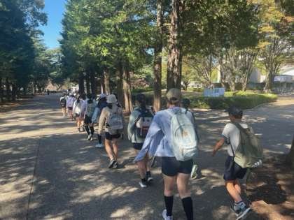とても良い天気の中、6年生の連合運動会が行われています。代沢小学校は、今日の午後、16校のみんなと競技します。バスで砧公園まできました。