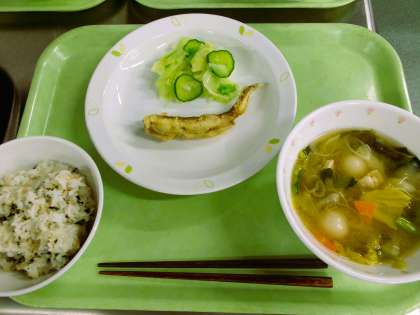 ごまわかごはん 牛乳 魚のから揚げ ひとしお野菜 白玉スープ