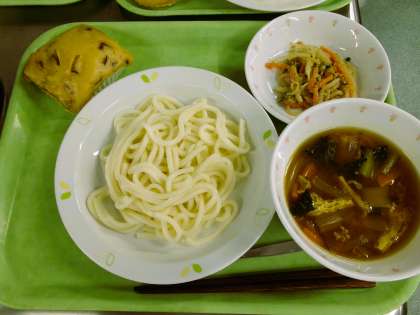 カレーうどん 牛乳 もやしのごまあえ 黒砂糖蒸しパン
