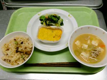 まめまめごはん 牛乳 千草焼き わかめサラダ 粕汁