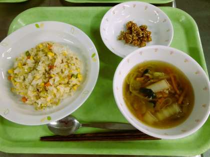 チャーハン 牛乳 大豆とじゃこの甘辛あげ 春雨のスープ
