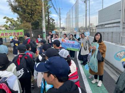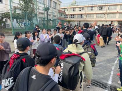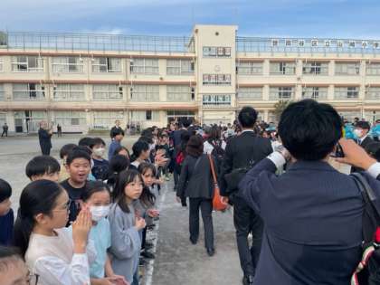 商店街の大歓迎の中を通って山崎小学校に到着。代沢小学校の5年生、保護者の方が山崎小学校の全校の皆さんと一緒に迎えています。