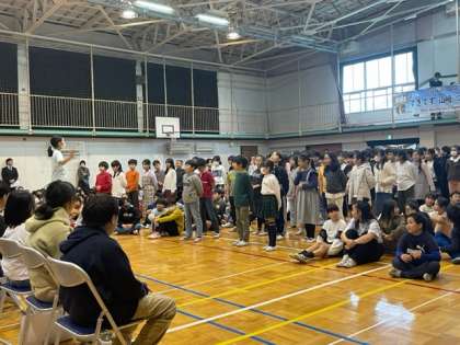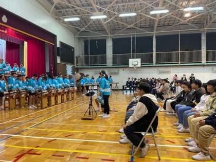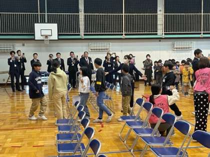 山崎小学校の6年生の山崎太鼓の演奏で歓迎式が始まりました。3校の校歌では、5年生が代表として元気に歌いました。