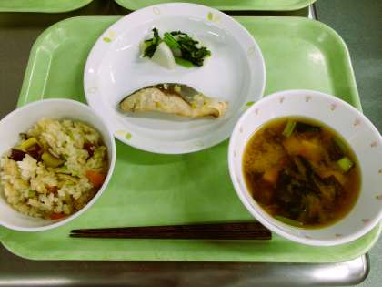 吹き寄せご飯 牛乳 魚の麹焼き かぶの甘酢かけ みそ汁