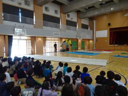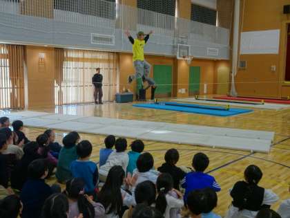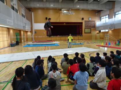 東京都教育委員会が行っている「笑顔と学びの体験プログラム」で、3年生が「スラックライン体験とチームビルディングを行いました。最初に講師のプロの方がスラックラインの技を見せてくださいました。5cmのラインの上で繰り広げられる技に歓声が上がりました。