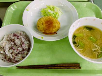 ゆかりごはん 牛乳 コロッケ ゆでキャベツ みそ汁