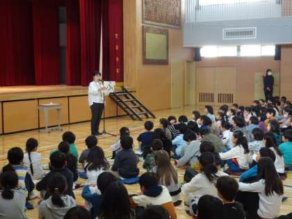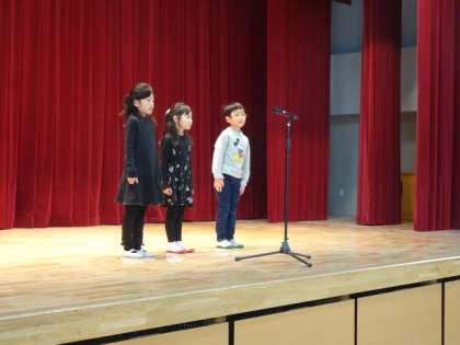 2学期の終業式を体育館で行いました。校長から今年の「代沢小の漢字」発表がのありました。390人から117の漢字がタブレットで応募され、その中で一番多かった漢字「楽」が今年の漢字に選ばれました。代沢小の子どもたちにとって今年は「楽しい」1年だったようです。終業式の代表の言葉は2年生でした。代表の3人が2学期頑張ったこと、3学期に頑張ることを全校のみんなの前で立派に発表しました。生活指導主任の安藤先生からは、冬休みの過ごし方のお話がありました。交通事故には十分に注意して冬休みを過ごしましょう。