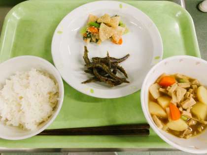 麦ごはん 牛乳 鶏じゃが 魚の磯香揚げ 野菜のごまみそかけ