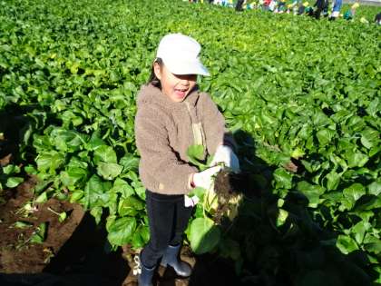 いよいよ収穫です。根元をもって力を入れて引っ張ると上手に抜けます。みんなで協力してたくさん収穫しました。