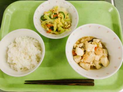 麦ごはん 牛乳 豆腐の五目いため 華風サラダ