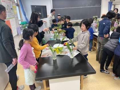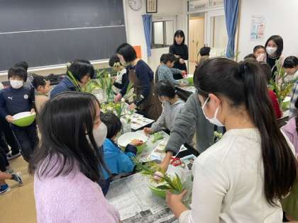 2月の花を生ける日の活動を行いました。今日は多目的室が展覧会の準備のため使えないので理科室で行いました。講師の先生のお話をしっかりと聞いて上手にいけることができました。