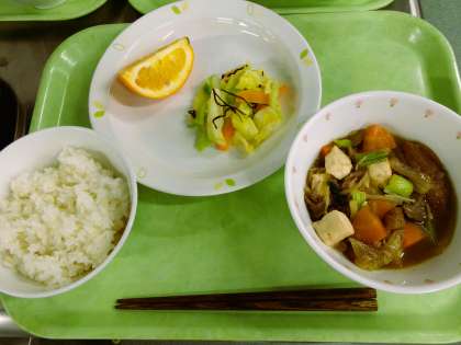 そして、すき焼き煮に入っている油麩は、宮城県登米の名産品で、小麦粉をこねたときにできるグルテンに、小麦粉を練り合わせ、棒状にして油で揚げたものです。調理員さんたちが、手間をかけ丁寧に煮上げたすき焼き煮、おいしくいただきましょう。
