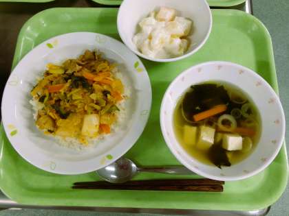 今日は、子どもたちの大好きなキムチ丼です。さて、このキムチはどこの食べ物でしょうか。みなさん知っている通り、朝鮮半島の漬物です。ヤンニョンとよばれる、とうがらしとごま油、にんにく、しょうがなどのいくつかの材料を組み合わせて作った調味料に塩漬け白菜を漬け込んだものがキムチです。盛り付けたものは、残さず食べられるといいですね。
