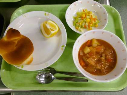 じょうとうパン 牛乳 トマトシチュー コーンサラダ くだもの(はるか)