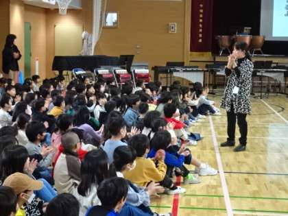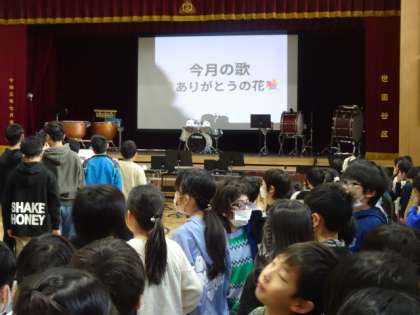 体育館に集合して音楽朝会を行いました。今月の歌は「ありがとうの花」です。3月1日(金)の「6年生を送る会」でみんなで歌います。手話の表現も入れて歌いました。3月1日も心を込めて歌いましょう。