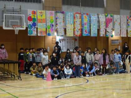 1年生・2年生・3年生の出し物です。6年生への感謝の言葉をしっかりと伝えたり、歌を歌ったり、一緒にゲームをしたり、どの学年も工夫して6年生への感謝の気持ちを伝えています。