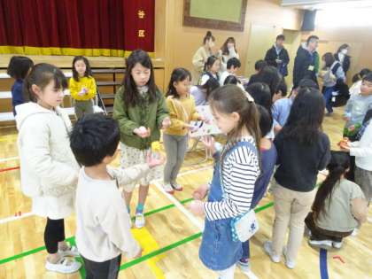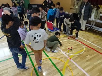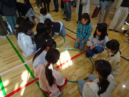 2・3校時に体育館で、1・2年生の昔遊び交流会がありました。2年生が1年生に対して遊びの仕方をしっかりと教えていました。たくさんの保護者の方にも見ていただき、1年生も2年生も楽しく活動しました。