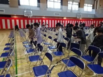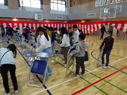 主事さんが紅白幕をつけてくれた体育館の椅子ならべや、昇降口の飾り付けなど5年生がしてくれました。椅子を丁寧に並べている姿に6年生への感謝の気持ちが表れています。