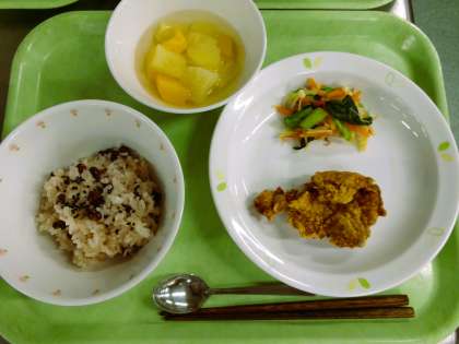 赤飯 牛乳 鶏肉の竜田揚げ 野菜のおかかかけ フルーツカクテル