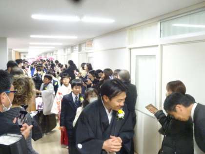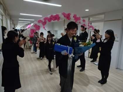 雨が降っているため「門出おくり」は、校舎の中で行いました。教室から2階の廊下、3階の廊下にたくさん並んだ先生方や保護者の方の大きな拍手と「おめでとう」の声の中を少し照れくさそうに歩いています。