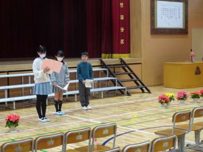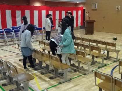 二つ目の作業は、入学式の準備です。割り当てられた作業を協力して行っています。6年生の頑張りで入学式の準備も整いました。8日(月)からの新学期、今日の経験を活かしながら、最上級生として活躍してくれることを期待しています。入学式で歓迎の言葉を言う代表の子の練習も行いました。しっかりとした態度で練習に臨んでいました。当日も、代表としてあたたかく1年生を迎えましょう。