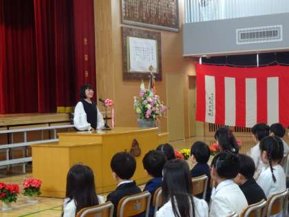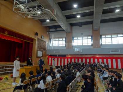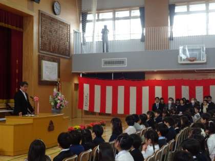 入学式が始まりました。しっかりと椅子に座って校長先生の話やPTA会長の話を聞いています。担任の先生と「よろしくお願いします」のあいさつも元気にできました。