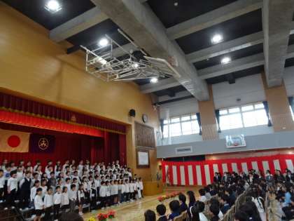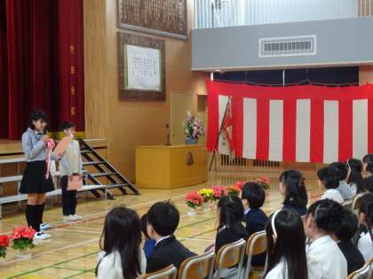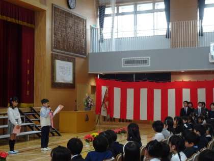 1年生の入学をお祝いして3人の6年生が学校の生活についてお話をしてくれました。一人一人の話をしっかりと聞いていました。明日からお世話をしてくれる6年生、困ったことがあったら助けてもらいましょう。今年の入学式から2年生の歓迎の歌も行えるようになりました。3学期に練習した成果をしっかりと発揮していました。来賓の方々からも2年生へのお褒めの言葉をいただきました。2年生からもたくさんのこと学んでいきましょう。