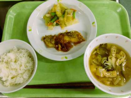 麦ごはん 魚のかわりソースかけ 野菜のおかかあえ みそ汁