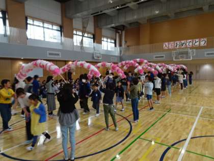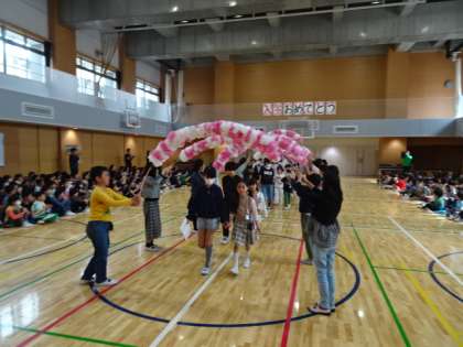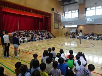 体育館で「1年生を迎える会」を行いました。全学級が集まっての「1年生を迎える会」は、新校舎になって初めてひな壇に座って6年生の歓迎の言葉をしっかりと聞いています。