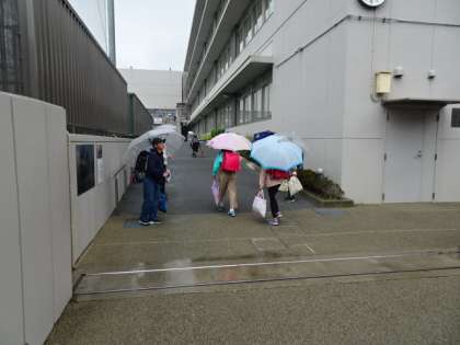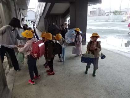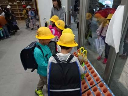 あいにくの雨ですが、子どもたちは元気に登校してきました。自分の出席番号を覚えた1年生。傘をしっかりと止めて、自分の場所に入れてから教室に向かいます。