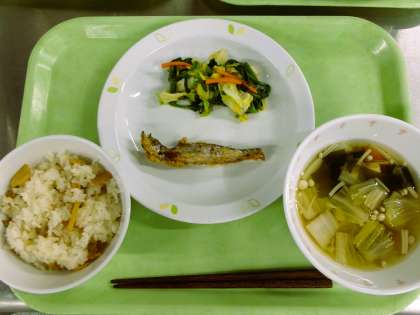 たけのこごはん 牛乳 ししゃものごま揚げ 野菜のおひたし 豆腐汁