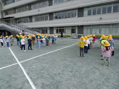 朝の時間に校庭に1年生が集合してラジオ体操をしています。初めてのランランタイムでのラジオ体操。初めての子も先生の動きをみながら頑張ってラジオ体操に取り組みました。