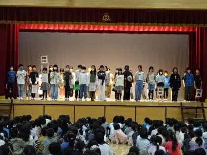 前期の代表委員、委員会の委員長が全校の前で、抱負や活動の紹介をしました。体育館で行うのは初めてで緊張しているようでしたが、みんなの拍手を受けて頑張ろうという意欲が高まったようです。
