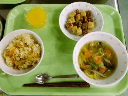 中華おこわ 牛乳 かつおのから揚げ 中華スープ フルーツゼリー