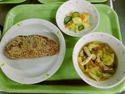 今日は、子どもたちの大好きなあべパンです。あげパンは、国産の米粉から作ったパンを使っています。小麦粉のパンよりも、少しもちもちした食感を楽しむことができます。いつもと違うパンを味わって食べてください。また、あげパンにまぶしてある ごまには、ミネラルと呼ばれる栄養がたくさん含まれます。