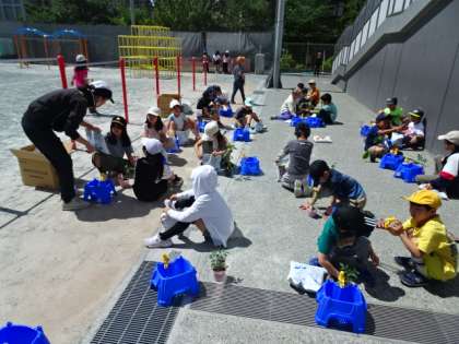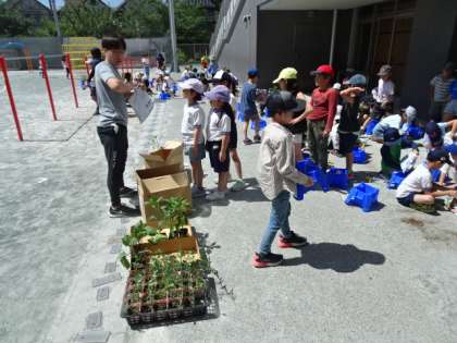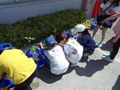 2年生が、生活科で夏野菜の苗を植えました。自分の鉢にしっかりと飢えて水やりをしました。元気に育つようお世話をしっかりとしてきましょう。