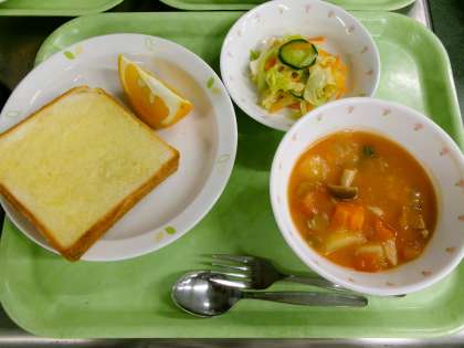 ガーリックトースト 牛乳 鶏肉のトマト煮 野菜のドレッシングかけ くだもの(雪中貯蔵甘夏 特別栽培 熊本他)