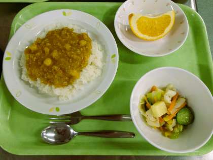 ドライカレー 牛乳 ポテトサラダ くだもの(木なりはっさく)