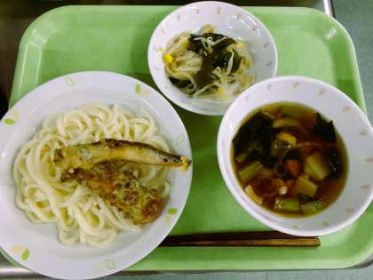 村山かてうどん 牛乳 ししゃも天 磯辺揚げ わかめサラダ