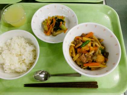 本日のきんぴら煮は、じゃがいもを揚げて、コクをプラスしています。ひと手間かけたおいしさを感じてほしいなと思っています。