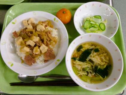 豚丼 牛乳 ひとしお野菜 かきたま汁 くだもの(冷凍みかん)