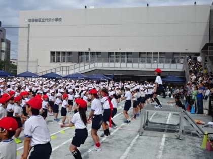 良い天気の中運動会が始まりました。全学年の児童が集まっての開会式。運動会の歌も元気に歌えました。ラジオ体操もしっかりして運動会の準備が整いました。