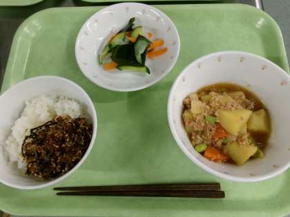 ごはん 牛乳 かみかみ佃煮 じゃがいものそぼろ煮 わかめの酢の物