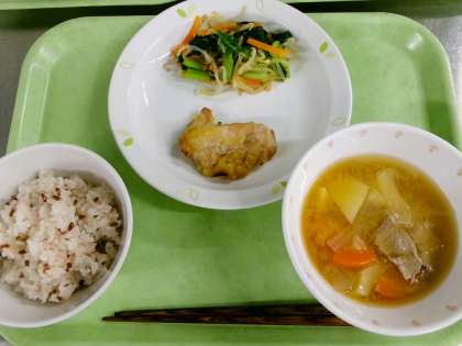 赤米ご飯 牛乳 鶏肉の塩麹焼き おひたし みそけんちん