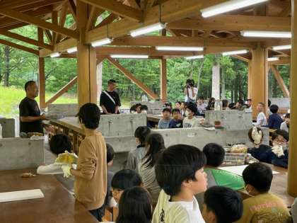 1日めの夕食は、自分たちで作るカレーです。まず、補助員さんから説明を聞きます。しっかり話を聞いて協力して美味しいカレーを作りましょう。